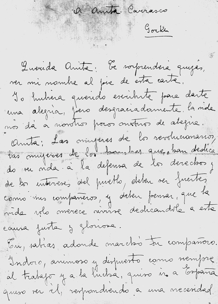 Solo en abril de ese año Anita se enteraría, por carta de Dolores Ibárruri, del fallecimiento de su marido.