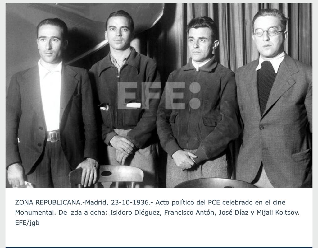 Los nombres citados podrían corresponder a referentes de la militancia comunista y del mundo cultural valenciano en los años treinta. Ángel Gaos (1908–1990), jurista y militante del PCE, encarnaba la faceta intelectual, muy ligado a la revista Nueva Cultura. Josep Renau (1907–1982), cartelista y agitador visual, era ya entonces una de las figuras más destacadas de la propaganda comunista y del Frente Popular. El apellido Sanchis apunta con fuerza a Joaquín Sanchis Serrano, “Finezas” (1889–1957), fotógrafo que documentó tanto a la CNT como al PCE en Valencia, y cuya cámara se convirtió en testigo de actos y congresos del partido. Y, finalmente, el camarada Surio, probablemente Arturo Surio García, veterano militante comunista valenciano, fusilado en Paterna en 1940.