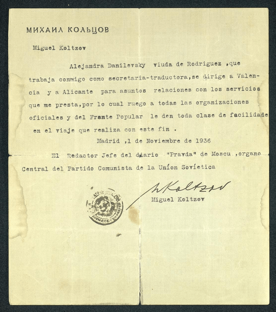La operación se hizo bajo identidad falsa: el 5 de agosto de 1937 se le expidió un pasaporte a nombre de Manuel Torres González. Los sellos del documento trazan el recorrido: cruzó a Inglaterra por Dover el 28 de agosto, y llegó a Leningrado el 2 de septiembre de 1937 a bordo del vapor soviético Sibir.