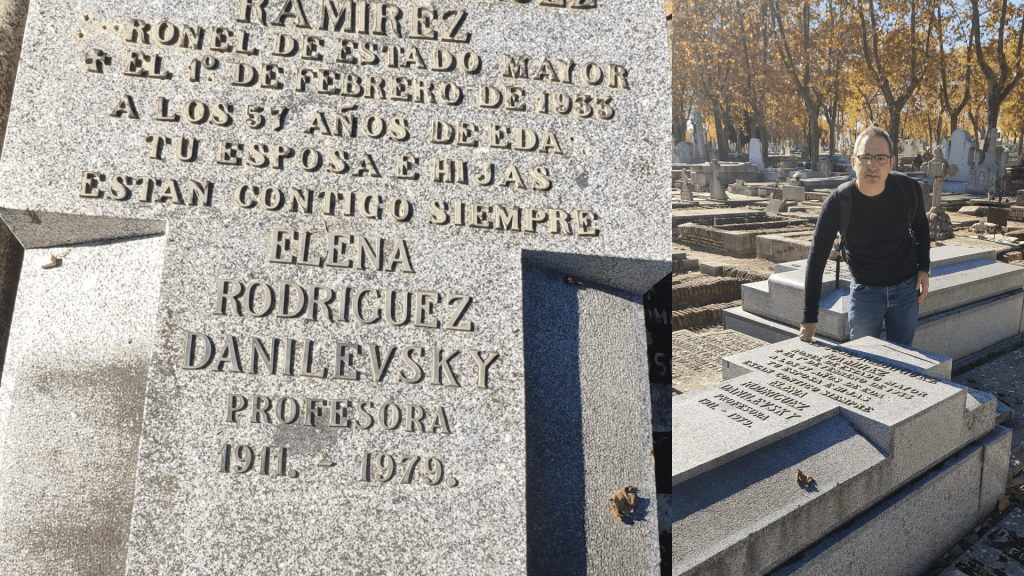 Finalmente, me detuve frente a la tumba de mi abuelo. Llevábamos un ramo de flores. Sus cenizas habían sido trasladadas desde Moscú en 1990, poco después de su muerte. En la lápida, encargada por mi tio Juan y por mi madre, puede leerse: